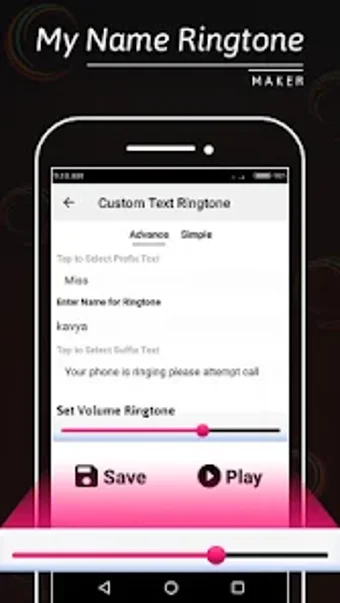 يوفر التطبيق واجهة مستخدم سهلة الاستخدام مع خطوات سهلة الاستخدام لإنشاء نغمة رنين مخصصة. يمكنك البدء بإضافة بادئة قبل اسمك، وكتابة اسمك ليتم الاتصال به عند استلام مكالمة، وإضافة لاحقة بعد اسمك. بمجرد إنشاء نغمة الرنين الجديدة الخاصة بك، يمكنك تعيينها لجهة الاتصال أو تعيينها كنغمة رنين افتراضية.